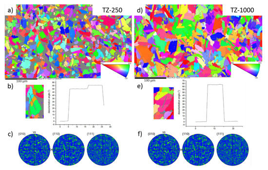 High-resolution electron backscatter diffraction pattern for the samples TZ-250 (a) and TZ-1000 (d) with representation of disorientation angle between grains for sample TZ-250 (b) and TZ-1000 (e). Pole figures for the sample TZ-250 (c) and TZ-1000 (f).