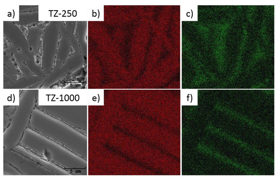 Chemical elements distribution maps (Figure 5) performed using the EDS detector showed homogeneous distribution of the elements within the grains. However, on the grain boundaries a small decrease of titanium and a small increase of the zirconium can be observed. Such observations can indicate that the surface of the grain is slightly enriched with the zirconium. Also, small holes were observed at the grain boundaries, the location and nature of the cavities suggest that those were formed during the etching process for metallurgical structure observation, and would not influence the corrosion stability [40]. However, there is the possibility that the loss of titanium was also connected with the etching process, because the solution used for etching could be more favorable for boundaries of grains and titanium [51,52,53].