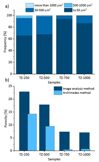 A more detailed analysis of the number and size of the pores in the samples is also presented in Figure 6a. The number of pores with a cross-sectional area higher than 500 µm2 was the largest for the pressure force of 250 MPa and was about 5% of all pores. The amount of large surface pores gradually decreases when the pressure force of isostatic pressing increases. Such a large cross-sectional area results from the existence of the interconnected pores systems. In the case of materials to be used for implants, interconnection of the pores is of great importance due to the ability of the cells and body fluids to penetrate into the implant.