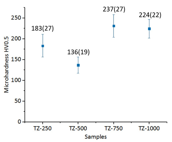 The quantitative analysis of the microstructure, including the determination of the cross-sectional area of the grains and the subgrains as well as the coefficient of grain variability, were performed based on optic microscope images. For the samples TZ-250, TZ-500, TZ-750 and TZ-1000, the average section areas of grains were 35.06 µm2, 33.15 µm2, 21.17 µm2 and 34.85 µm2 respectively (Table 3). In terms of the stereological parameter, the sample produced under the pressure of 750 MPa had a different microstructure. The coefficient of the grain variability was also determined. For all the samples this was over 1 (from 1.13 to 1.40). This means that in terms of the size of the cross-sectional area, the resulting structure is strongly diversified. The number of elements that were tested per unit area of the image were also determined and for samples TZ-250, TZ-500, TZ-750 and TZ-1000 were 14,279, 15,967, 25,526 and 3675 (1/mm2), respectively. This value correlates with the other analyzed parameters, especially in the case of material made under 750 MPa pressure. The surface adsorption theory can be used to explain the differences of the grain growth, which can be connected with the size of particles or pressure used. The theory of adsorption says that the plane that has higher surface tension grows fastest, while its adsorption amount of surface-active material is maximized. As a result, the surface energy decreases and therefore the growth of this plane reduces [44].