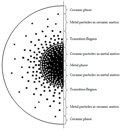 Material gradation of metal and ceramic phases along the radial direction of the shaft shown in the cross-sectional area of the shaft.
