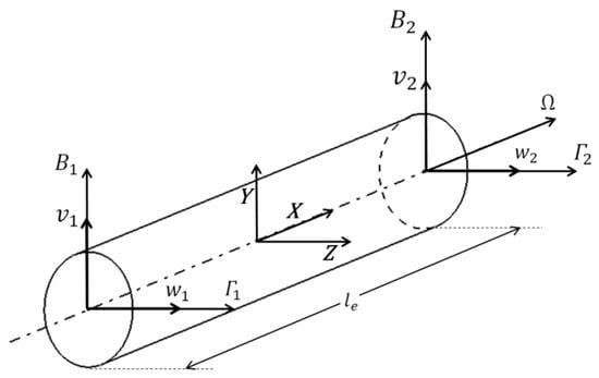 The finite element formulations of the FG shaft were developed using Timoshenko beam elements with two nodes with four degrees of freedom per node, two translational (, ) and two rotational (, ), where the effects of translational and rotary inertia, transverse shear deformations and gyroscopic moments were considered. As analysis was performed for bending natural frequencies, which are appropriate in the case of a Jeffcott rotor supported on the linear bearings in transverse directions, the axial translational degree of freedom was not considered. Figure 3 shows the FG shaft element with nodal degrees of freedom. The shaft was divided into finite beam elements of length (). The Timoshenko beam element matrices for a homogenous shaft were first developed by Nelson [] using Hamilton’s extended principle with energy and work functions. The equation of motion in matrix form for a finite rotating shaft element can be expressed as: