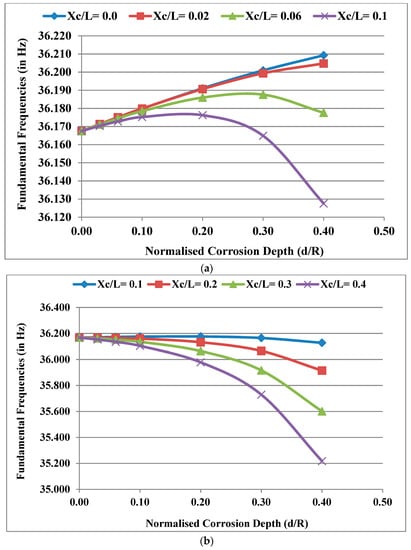 Considering the power law index k = 0.5, temperature gradient ΔT = 0 and normalised corrosion length Lc/L = 0.02, the fundamental frequencies of the system were obtained for different normalised corrosion depths d/R and plotted for different normalised corrosion locations Xc/L as shown in Figure 5a,b. With an increase in depth (d/R) of the corrosion at the bearings (Xc/L = 0), the fundamental frequency of the system increases. As the position (Xc/L) of the corrosion is further away from the bearings as in the case of Xc/L = 0.1 in Figure 5a, the rate of increase in the frequency decreases and the frequency starts to decrease after reaching a peak. As the corrosion position moves near the disc, the increase in frequency is not noticed and the frequency only decreases with an increasing negative slope as the corrosion depth (d/R) increases, which is clear from Figure 5b. The reason behind the phenomenon is that corrosion results in the loss of mass and a decrease in stiffness, which affects the natural frequencies of the system (. The decrease in stiffness of the corroded rotor system will not occur if the corrosion takes place near the bearings due to the significant bearing stiffness. Hence, the effect of a decrease in the stiffness of the rotor system due to an increase in corrosion depth (d/R) is initially insignificant near the bearings compared to the effect of the loss of mass due to corrosion. As a result, the fundamental frequency of the system increases initially due to corrosion before it decreases. However, as the position of corroded shaft elements moves away from the bearings, the effect of a decrease in stiffness due to corrosion becomes more significant than the effect of the loss of mass. As a result, the fundamental frequency of the system decreases due to corrosion.