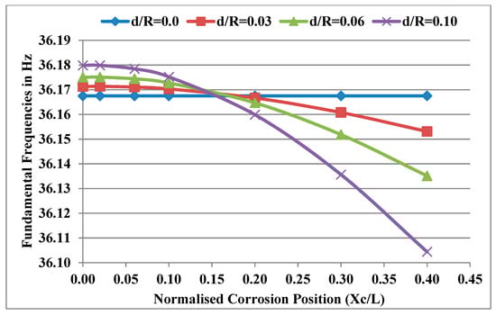 Considering the power law index k = 0.5, temperature gradient ΔT = 0 and normalised corrosion position Xc/L = 0.16, the fundamental frequencies of the system were obtained for different normalised corrosion depths d/R and plotted for different normalised corrosion lengths Lc/L as shown in Figure 6. It was observed that the rate of decrease in frequency with the increase in corrosion depth increases with the increase in corrosion length. At a constant corrosion depth, the frequency decreases with the increase in corrosion length. The rate of decrease in frequency with the increase in corrosion length increases with the increase in corrosion depth. This is because the stiffness decreases with the increase in corrosion length and depth, and the effect of the decrease in stiffness increases as the length of corrosion increases in the direction away from the bearings and near the disc.