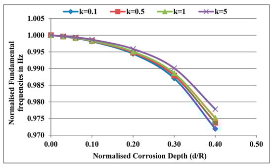 Considering a temperature gradient ΔT = 0 and normalised corrosion length Lc/L = 0.02, the normalised fundamental frequencies (subscripts uc and c are uncorroded and corroded, respectively) are computed for different corrosion depths and power law indices. Figure 8 shows the variation of normalised frequencies with the corrosion depth for different power law indices. It was observed that the normalised frequencies decrease with the increase in d/R for any power law index. The rate of decrease of these normalised frequencies was found to decrease with the increase in the k value. The Young’s modulus of the shaft increases from the outer surface to the inner surface with a decreasing slope for higher values of k and with an increasing slope for lower values of k. Therefore, the stiffness of the outermost part of the shaft compared to the innermost part decreases with an increase in the k value. As a result, the percentage reduction of stiffness due to corrosion decreases and the rate of decrease of normalised frequencies decreases with an increase in the k value.