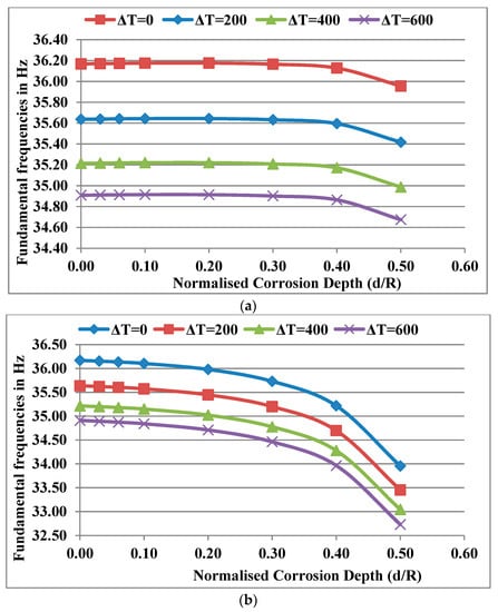 Considering the power law index k = 0.5, a normalised corrosion position near the bearing Xc/L = 0.1 and normalised corrosion length Lc/L = 0.02, the fundamental frequencies obtained for different normalised corrosion depths (d/R) were plotted for different temperature gradients ΔT as shown in in Figure 9a. The frequencies decrease with an increase in d/R at any particular temperature gradient and the rate of decrease in frequencies for different ΔT curves remains the same at any value of d/R. As the temperature gradient increases, the frequencies decrease as expected. Figure 9b shows the variation of frequencies when corrosion occurs near the disc at Xc/L = 0.4. It was noticed that the rate of decrease in frequencies is comparatively higher as the depth of corrosion (d/R) increases. The variation of frequencies due to corrosion at lower values of Xc/L (corrosion position near bearings) is due to the predominant effect of the loss of mass, which is not influenced by ΔT. The mass is considered to be independent of temperature. However, at higher values of Xc/L (for corrosion position away from the bearings and near the disc), the variation in frequencies is due to the predominant decrease in stiffness. The effect of corrosion, which is influenced by ΔT as the stiffness, depends on the temperature-dependent Young’s modulus.