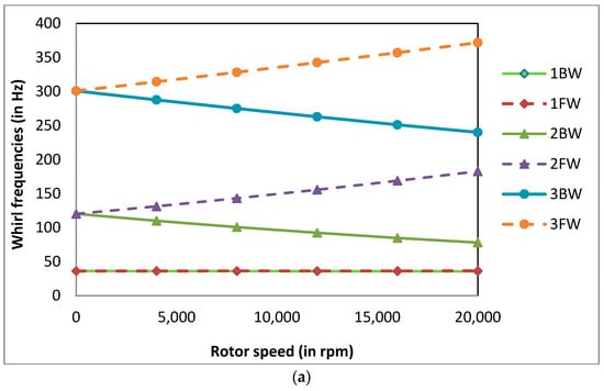 The whirl frequencies at = 4000 rpm were calculated for FG rotor-bearing systems with and without corrosion for different temperature gradients of the shaft with the power law index k = 0.5, normalised corrosion depth d/R = 0.1 and normalised corrosion length Lc/L = 0.02. The whirl frequencies are tabulated in Table 6. It was observed that the whirl frequencies of the rotor system decrease with the increase in temperature gradient of the shaft and decrease due to the presence of corrosion in the rotor system. The percentage decrease in 1BW and 1FW whirl frequency of the rotor system due to the presence of corrosion decreases as the thermal gradient increases. The Campbell diagrams for different values of ΔT at a normalised corrosion depth d/R = 0.1 is shown in Figure 11a–c. The Campbell diagrams obtained for different thermal gradients are similar, therefore they are not plotted here. It can be observed from Campbell diagrams that the split between 1FW and 1BW is negligible compared to 2BW and 2FW.