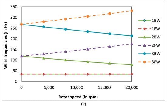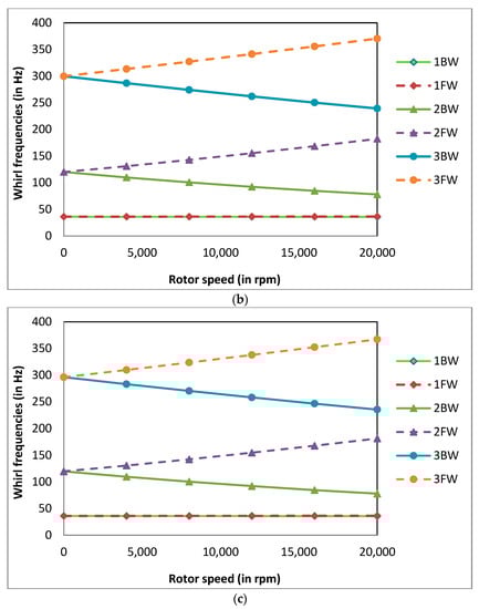 The whirl frequencies at = 4000 rpm were calculated for different corrosion depths at different corrosion positions for the power law index k = 0.5, temperature gradient ΔT = 0 K and normalised corrosion length Lc/L = 0.02. The whirl frequencies are tabulated in Table 5. At lower values of Xc/L (for corrosion near the bearings), there is an initial increase in the whirl frequencies due to corrosion as the d/R values increase, which is not observed as the Xc/L value increases (as corrosion position moves away from the bearings) for the same reasons mentioned earlier for natural frequencies. The percentage increase in the whirl frequencies due to the presence of corrosion decreasing for higher values of Xc/L as the corrosion position moves away from the bearings. As the Xc/L value increases further (as corrosion position nears the disc), there is no increase in whirl frequencies. The whirl frequencies start to decrease and the percentage decrease in whirl frequencies increases. Here, the subscripts c and uc denote corroded and uncorroded systems, and ω denotes the whirl frequencies of the system. Therefore, it is necessary to take precautions to prevent corrosion near the disc rather than near the bearings. The Campbell diagrams at different values of Xc/L for a normalised corrosion depth d/R = 0.1 are shown in Figure 10a–c. The Campbell diagrams obtained for different corrosion positions are similar. It can be observed from the Campbell diagrams that the split between 1FW and 1BW is negligible compared to 2BW and 2FW.