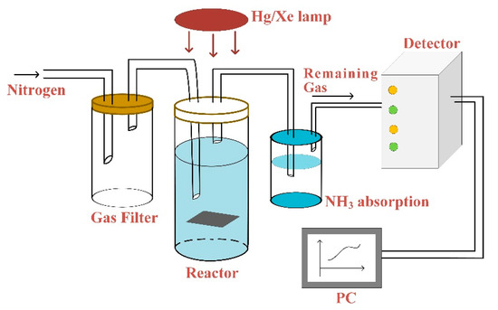 A 450 W high-pressure Hg/Xe lamp was used for photo-induced ammonia production, which was installed in an Oriel lampshade 12 inches from the sample. Wavelength range was from 200 to 800 nm and the reaction vessel was indicated in Figure 1. N2 was entered into the gas filter in order to make sure purity of the reaction gas without impurities. Experiments are carried out under sealed condition without mixed gas to ensure the accuracy. Then, slowly blow N2 into a container filled with 18.2 MΩ water (Barnsted NanoPure, Thermo Scientific, Waltham, MA, USA) and 0.01 M high purity (Alfa Puratronic, Charlotte, NC, USA, 99.9955%) Na2SO4. The vessel was sealed with a quartz cover and illuminated for different periods of time. The gas exported from vessel was run through the NH3 absorption bottle and finally taken out the system which aimed to detect other generated remaining gas. The ammonia yield from the reaction vessel and NH3 absorption bottle was measured by using the indophenol blue method for specific lengths of time [29,30]. Before experiments, a standard absorption curve was obtained using ammonium chloride solutions with known concentration. After completing experiments, we removed a 2 mL aliquot of the solution from the reaction vessel. Then, dilute 0.100 mL of 0.05 mol/L NaClO with 2 mol/L NaOH and 0.1 mL of 0.4% (by weight) Na [Fe(NO)(CN)5] (sodium nitroferricyanide) aqueous solution. Finally, 0.5 mL solution of 5% salicylic acid, 5% sodium citrate (by weight), and 2 mol/L NaOH were added to the above solution. All of reagents were utilized in their purest form. The accuracy of the method is that when 1.0, 3.0, 5.0, 7.0 µg ammonia yield is added to the sample solution, the average recovery is 100%. The precision of the method is when the ammonia yield in the sample is 1.0, 5.0, 10.0 µg/10 mL, the coefficient of variation is 3.1%, 2.9%, 1.0%. The average relative deviation is 2.5%. Effective measures have been taken to eliminate interferences. For example, multiple cations (Ca2+, Fe3+, Mg2+, Mn2+) have been complexed by salicylic acid. After 1 h, the absorption spectrum was measured using a PE Lambda950 ultraviolet-Vis-NIR spectrophotometer. The formation of indophenol blue was determined using absorbance at a wavelength of 635 nm [31,32].