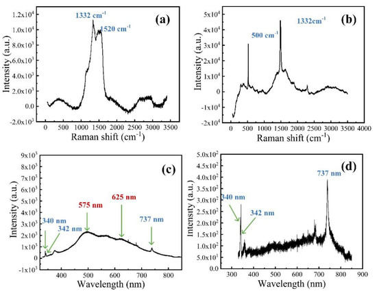 Raman spectroscopy is employed for analyzing the composition of chemical vapor deposited diamond films, mainly because the scattering effect of graphite and amorphous carbon (peaks on 1520 cm−1) is very obvious and 1332 cm−1 has been recognized as a characteristic peak derived from sp3 diamond crystals [11,36]. Wherefore, the 632 nm laser photoexcitation was used to measure Raman spectra of N-doped diamond, and undoped poly-crystalline diamond, as shown in Figure 3a,b, respectively. Peaks on 1332 and 1520 cm−1 represent diamond and graphite in Raman spectra of the nitrogen-doped diamond film, which means D (diamond) and G (graphite) bands. Differently, the peak on 500 cm−1 as a result of silicon substrate in the polycrystal diamond film is much higher than it is in the nitrogen diamond film. However, silicon has no effect in the experiment, there will be a comparative experiment in the following part. In addition, the characteristic peak position of Raman spectrum (see Figure S3) is 1332.15 cm−1, which is the characteristic peak position of the single crystal diamond. Moreover, the NV center is as a deep-level defect in diamond defect with C3v symmetry consisting of a substitutional nitrogen–lattice vacancy pair orientated along the (111) crystalline direction. The center may be found as an ‘in grown’ product of the chemical vapor deposition (CVD) diamond synthesis process added N2 gas in bulk and nanocrystalline diamond [37,38]. We investigated the PL spectrum at 325 nm for certifying features of NV− and NV0, which are their optical zero phonon lines (ZPLs)at 1.945 eV (637 nm) and 2.156 eV (575 nm), respectively [39]. Thus, PL spectrum of nitrogen-doped diamond films are depicted in Figure 3c. Two peaks around 575 and 625 nm can be discovered in the nitrogen-doped diamond film, indicating ZPL spectral characteristics of the NV0 and NV− charge states. Corresponding to Raman spectrum, 340 and 342 nm peaks appear for nitrogen-doped, verifying the existence of diamond and graphite phase one more time, respectively. Besides, we also reveal undoped polycrystal diamond fluorescence properties for contrast, which is illustrated in Figure 3d. A PL peak at 737 nm is attributed to Si–V defect [40]. Few other specific peaks appear except for 340 nm (diamond phase), 342 nm (graphite phase), and 737 nm (Si–V defect). Consequently, the nitrogen-doped diamond film contains extra NV defect energy level in the forbidden gap compared with the undoped diamond film.