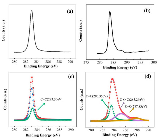 The X-ray photoelectron spectroscopy (XPS), an important surface analysis technique, provides surface information with a thickness of 3–5 nm. Here, the XPS is utilized to measure the existence of C-O after experiments, which can strongly identify oxidation reaction on the surface of the diamond. Therefore, the comparison before and after reaction for high-resolution spectra of the C1s is depicted in Figure 4a,b. Simulation of the XPS spectrum toward the surface on the diamond after photocatalyst is shown in Figure 4c,d. the C1s peak was centered on ~283.7 eV [41]. The main oxygenated group in homoepitaxial films is ether (C–O–C), situated at 285.26 eV in {111} films [42,43]. The other oxygenated group is carbonyl (C=O) found at 287.83 eV [44,45,46]. The survey and high-resolution spectra show carbon with evidence of O at the surface after reduction. Thus, we suggested oxide reactions C + H2O→CO2 + 4H+ + 4e− and C + H2O→CO + 2H+ + 2e− on the surface may be generated in order to keep the law of conservation of electric charge [47,48]. In addition, the XPS survey spectra of nitrogen-doped diamond film after experiments and the high-resolution spectra of the C1s, O1s, and N are measured, as shown in the Supplementary Materials (Figure S4).