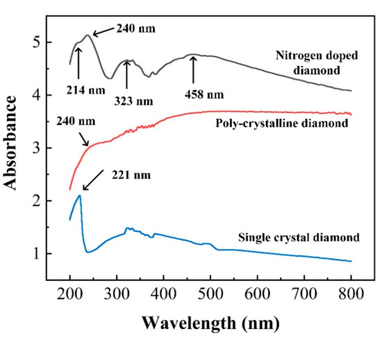 To explore whether the NV center has an influence on the optical properties of the diamond film, we used an integrating sphere to study the light absorption by converting UV-vis diffuse reflectance spectroscopy (DRS) (see Figure S7) since the incorporation of nitrogen impurities into the diamond film is accompanied by changes in both optical absorption and scattering from the film. The absorbance spectra range from 200 to 800 nm of NDD, PD, SCD are shown in Figure 6. Note that there is no vertical offset in the collected spectrum and the maximum saturation absorption of this instrument is 10. Over the entire wavelength region shown, the nitrogen-doped diamond shows higher absorbance, and also exhibits new peaks in the absorption spectrum at approximately ~320 and 460 nm, owing to nitrogen impurities [12,33,34,35]. All of the three samples also show a feature near 220 nm, which corresponds to the absorption for photon energies above the band gap of the diamond (λ < 225 nm). Polycrystalline diamond films show a feature near 240 nm, which is attributed to a direct (momentum-conserving) optical transition of bulk silicon [52,53]. A similar peak on 240 nm in the DRS of silicon (Figure S8) for comparison further proved the conclusion. In addition, the peak on 375 nm appearing in all samples may come from the fact that the deuterium lamp spectrum in this region is somewhat noisy. The results in Figure 5 and the Supporting Information indicated that the presence of nitrogen impurities increases optical absorption in the visible and ultraviolet region.