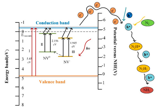 The mechanism of the influence of nitrogen levels in the diamond for reduction N2 to NH3 has been studied. The steps can occur by three pathways which are labeled in Figure 7-I, II, and III. The first step (I) in the photocatalyst for reduction indicates intrinsic excitation, the excitation from the conduction band to the valence band, which must occur under deep ultraviolet light. Electron transition from defect levels to the conduction band can be illustrated in the second step (II) and third step (III). The neutral state of NV0 (step II), as an acceptor impurity in diamond, can absorb the photon transition from the ground state to the excited state. When the excitation light energy is higher than 2.156 eV, the absorbed photon transitions to the conduction band to become free electrons, thereby breaking away from the bondage of the impurity center. The negatively charged state NV− (step III) transitions from the ground state to the excited state by absorbing an energy greater than zero phonon transition. NV− has a 3A ground state and a 3E excited state, with a 1A state located in between them, to which transitions are (nearly) forbidden, implying that the excited states are close to the band edges, while the ground states are in the middle of the band gap [33,34,35,36,37]. The excitation band is near the conduction band, which represents that it is easier for electrons to jump from nitrogen impurity levels to conduction band. At the same time, conversion from the NV− color center to a neutral NV can be carried out after losing electrons [54]. The intrinsic and extrinsic transitions both occurred under illumination. The radiative transitions between charge states have occurred optically at excited levels via the intermediate valence/conduction band. Furthermore, the non-radiative transitions are believed to connect with tunneling of electrons. When illuminated by light irradiation, the electrons transition would take place at the defect level, simultaneously occurring from valence band to conduction band. Therefore, more photo-generated electrons benefit from the activation of N≡N bonds.
