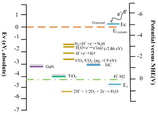 The electrochemical energy scale relative to normal hydrogen electrode (NHE) of the diamond and other band wide gap semiconductors was shown in Figure 8. The photocatalytic reduction of nitrogen requires the following steps. The first step to reduction is to form N2H with high energy. Electron transfer reaction H2O + e−→e− (aq.) has a reduction potential E of −3.2 eV versus NHE, which is the most possible way to form N2H [55,56]. In addition, the solvated electrons served as an intermediate to form H• (H+ + e−→H•). Then, the N2H can continuously react with H• to the subsequent reaction with e− and H• to ultimately NH3 [57,58,59]. It is notable that the electrochemical potential window of hydrogen terminated diamond is more negative at about 5.2 eV versus NHE. Thus, the diamond can be capable of initiating higher energy reduction reactions. Previous studies reported the approach for reduction of nitrogen was firstly and subsequently studied by using modified forms of TiO2 [60,61]. The N2 fixation yield in the visible area was less than 67%, due to the re-oxidation of intermediates and products by the pores in the deep valence band of TiO2 and weak absorption on the surface of reactant. In addition, the work function of TiO2 is 4.6 eV, which means electrons jumped to above the conduction band with barrier [60,61,62,63]. Other wide bandgap semiconductors such as GaN, SiC, due to lower potential energy, have more difficulty for the photocatalyst [56,64,65]. The hydrogen-terminated diamond, currently the only semiconductor with negative electron affinity, was used for an electron state source into liquids for initiating high-energy reduction. This provides a development direction for the field of catalysis.