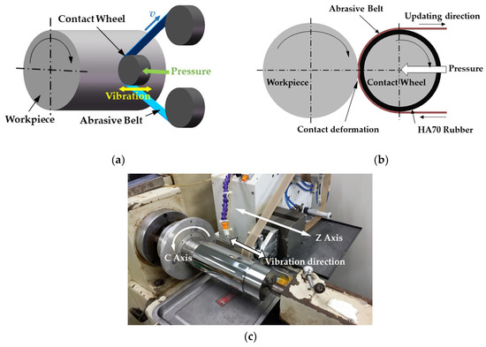 The principle of a shaft’s deterministic figuring using a vibration-assisted abrasive belt is shown in Figure 1. The axis of the contact wheel is parallel to the axis of the workpiece, whereas the outer ring’s material of the contact wheel is made of rubber with a hardness of HA70 and is covered with the abrasive belt. The contact wheel is fixed on a cylinder which can push the contact wheel to contact the workpiece with a constant pressure, resulting in deformation and forming one rectangular contact area. Vibration in the axial direction occurs at a certain frequency to provide the main movement of material removal. At the same time, depending on the linkage of the C-axis and Z-axis, the contact wheel can pass through the whole shaft’s surface. When the machining parameters such as the pressure of the cylinder, the vibrating frequency of the contact wheel, and the updating speed of the abrasive belt remain unchanged, because the contact wheel is always in contact with the workpiece due to pressure during the figuring process, a longer dwell time of the shaft’s surface in the contact area leads to more material being removed, and there is a linear relationship between the amount of removed material and the length of dwell time. Therefore, as long as the servo C-axis and Z-axis are controlled to move at a nonuniform speed, the high-error positions of the workpiece surface can remain in the contact area for longer time, thereby causing more material removal, while the low-error positions remain for a shorter time, with less material being removed. In this way, the contour of shaft parts is gradually corrected deterministically to approach an ideal cylindrical surface. Furthermore, due to the polishing effect of the abrasive belt, the surface quality of the workpiece can be improved during the improvement of shape accuracy in the process of figuring.