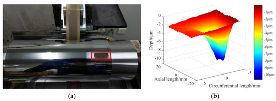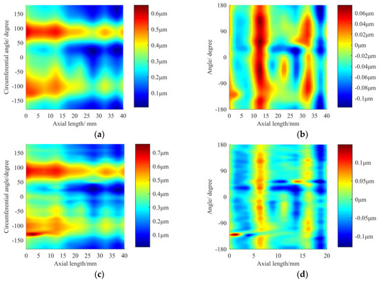 It is worth mentioning that the filtering method only filters the high-frequency error of the measured data, but does not filter the high-frequency error on the actual shaft’s surface. The correction of these high-frequency components is also skipped during actual machining. Therefore, contour errors with frequencies beyond the filtering range still exist before and after machining. For example, as shown in Figure 14b, there was an error peak at the frequency of about 0.2 mm−1 (61 UPR), the magnitude of which hardly changed before and after machining. However, according to the results of Section 3.1, the influence of the error at such frequency on the film’s flow field can be ignored; thus, it was not necessary to consider correcting the error at this frequency.