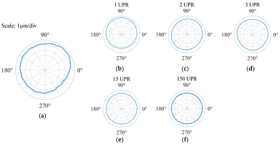 A schematic diagram of the contours with the harmonics containing different frequency components: (a) overall circular contour; (b) harmonic error with 1 UPR; (c) harmonic error with 2 UPR; (d) harmonic error with 3 UPR; (e) harmonic error with 15 UPR; (f) harmonic error with 150 UPR.