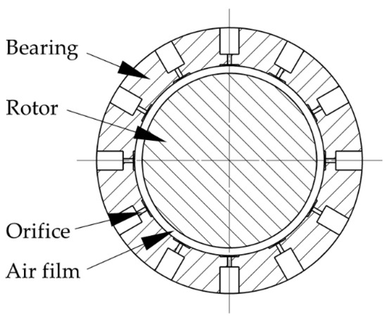 The reason why the aerostatic spindle has higher rotating accuracy than its manufacturing error is that the air film of the aerostatic spindle has an effect called error homogenization. At present, the main throttling forms of aerostatic spindles include orifice throttling, slit throttling, and porous throttling. As a typical throttling method of aerostatic spindles, orifice throttling has been widely used. The radial section diagram of an aerostatic spindle with orifice throttling holes is shown in Figure 4. Throttle holes are distributed evenly on the bearing of the spindle along the circumferential direction. Compressed air enters the gap between the bearing and the rotor through the orifice to form a layer of air film, of which the thickness is usually about 15–25 μm.