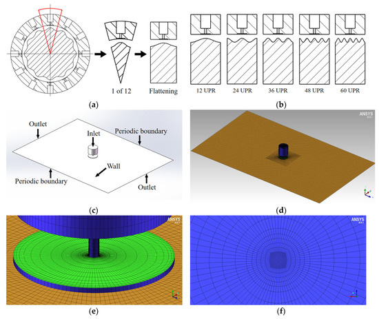 In order to more clearly show the contrast effect of qualitative analysis, and in order to make the cosine curve on the 1/12 model continuous and derivable on the boundary, we set the error in the same amplitude (2 μm), and the error frequency was preferentially set to 12 UPR, 24 UPR, 36 UPR, 48 UPR, and 60 UPR for numerical calculation. The mesh was divided into a structured mesh using the ICEMTM module in ANSYS. The preparatory work of a structured mesh is time-consuming, but the speed of mesh generation is fast, and the generated mesh allows easier convergence in subsequent calculations. At the same time, the quality of a structured mesh is better than that of an unstructured mesh under the same number of elements. In the Fluent module, we chose to use the K–ε turbulence model. The calculation method used the SIMPLE algorithm, and the under-relaxation factors of pressure, density, body forces, and momentum were set to 0.2, 0.8, 0.8, and 0.6, respectively [20]. A slower convergence speed was used in exchange for a higher convergence accuracy.