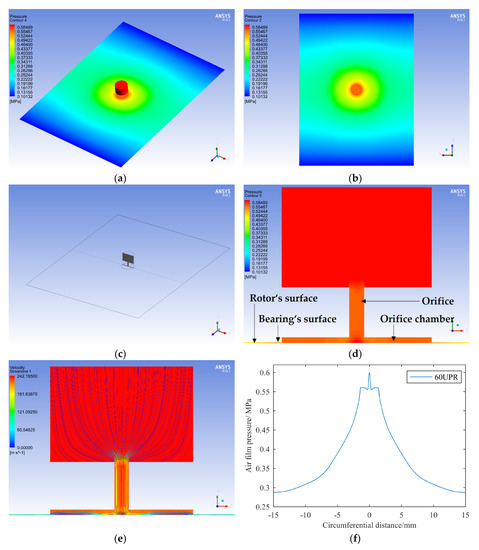 We inserted a radial section through the center of the orifice, as shown in Figure 7c, and then focused on analyzing the pressure distribution on the intersection line between the above section and the shaft’s surface. According to the results, the film’s pressure was the maximum at the position right below the orifice, which was close to the inlet pressure. The air pressure in the rest position of the orifice chamber was basically constant, and the pressure gradually decreased toward the outlet surface and periodic boundary.