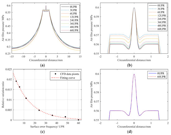 Comparison of CFD results of contour error in different frequencies: (a) pressure distribution curve on the rotor’s surface along the circumferential direction; (b) local amplified pressure distribution at the position of orifice chamber; (c) relative variation ratio of the film pressure under different contour error frequencies; (d) comparison of pressure distribution at the orifice chamber with a contour error frequency of 0 UPR and 60 UPR.