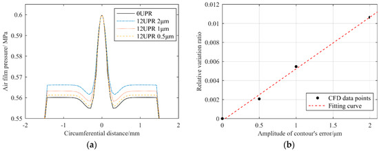 Comparison of CFD results for different error amplitudes when the frequency was fixed at 12 UPR: (a) comparison of pressure distribution at the orifice chamber; (b) relative variation ratio of the film’s pressure.