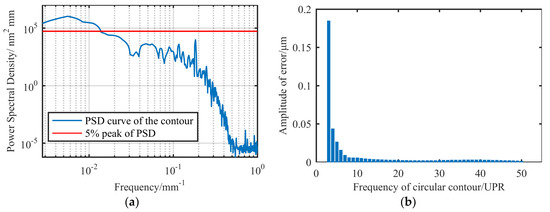 In fact, by further analyzing the measurement contour, it can be obtained, as shown in Figure 10b, that the error amplitude of 7 UPR was already less than 0.01 μm, which was less than 5% of the corresponding amplitude of 3 UPR. Therefore, from the perspective of the PSD curve, the main contribution to the RONt is the component between 3 and 6 UPR. Figure 10b shows a trend of rapid decay before exceeding 10 UPR, where it enters a stage of slow decay with amplitudes of less than 0.005 μm.