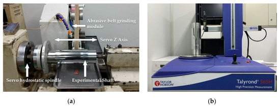 Actual figuring and measuring equipment of the experimental shaft: (a) modified lathe; (b) TalyrondTM 565H cylindricity meter.
