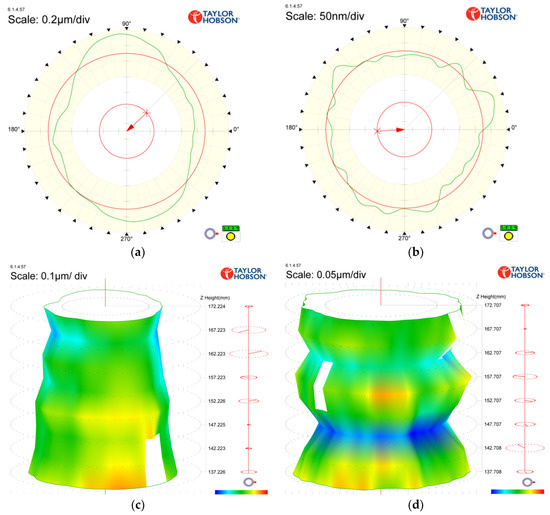 The RONt and CYLt of the shaft can be measured using a CMM (coordinate-measuring machine), cylindricity meter, and other equipment. The measuring equipment we used was a TalyrondTM 565H cylindricity meter made by Taylor Hobson®. The cylindricity meter adopts the structure of the spindle rotating while the measuring arm is not rotating. The measuring surface is contacted by the ruby probe, and the contour’s offset signal is output by a precise sensor. The measurement uncertainty is less than 30 nm, and the maximum number of sampling points of one circle is 18,000 points. Through processing using software, closed circular contour data can be obtained.