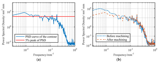 PSD analysis of peripheral contour after machining: (a) PSD characteristic curve after machining; (b) comparison of PSD characteristic curve before and after machining.