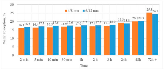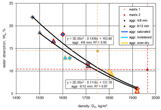 The water absorption of tested concretes turned out to be strongly dependent on their densities, since it was determined by the porosity of both the aggregate and the cement matrix. The higher the density, the lower the water absorption of the composites (Figure 10). However, the relationship differed slightly for concretes made of aggregates of different sizes. Surprisingly, less water absorption was revealed by concretes prepared with the more porous and weaker 6/12 mm aggregate. This probably resulted from the fact that the 6/12 mm aggregate contained fewer crushed particles than the 4/8 mm aggregate (Figure 1). Such a hypothesis may be proved by the lower absorption of the bigger fraction after saturation in water for more than 72 h (Figure 2).