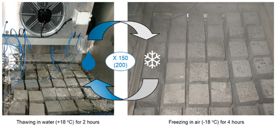 The test of freeze-thaw resistance began with the saturation of twelve concrete specimens in water until their weights stabilized. Six specimens were used as references and the other six were subject to freeze-thaw cycles. Freezing was carried out in air at −18 ± 2 °C for at least 4 h, while thawing took place in water at +18 ± 2 °C for 2–4 h. For this research, the number of cycles was assumed to be as high as 150, which is the typical value for concrete structures and structural members subject to freeze-thaw attack, including conditions of water capillary action, the fluctuation level of water, and the possibility of de-icing agent application. In the case of one concrete series (2d), which did not reveal any signs of frost damage after 150 cycles, an additional 50 cycles of freezing and thawing were carried out on half of the specimens. The scheme of freeze-thaw cycles used in this research is presented in Figure 3. After the freezing and thawing cycles, the appearance of the specimens was assessed for cracks, and the weight and strength losses were determined. Concrete was regarded as fulfilling the criteria for freezing and thawing resistance at an assumed number of cycles when it did not reveal any cracks, the weight loss was lower or equal to 5%, and the strength loss was not greater than 20%.