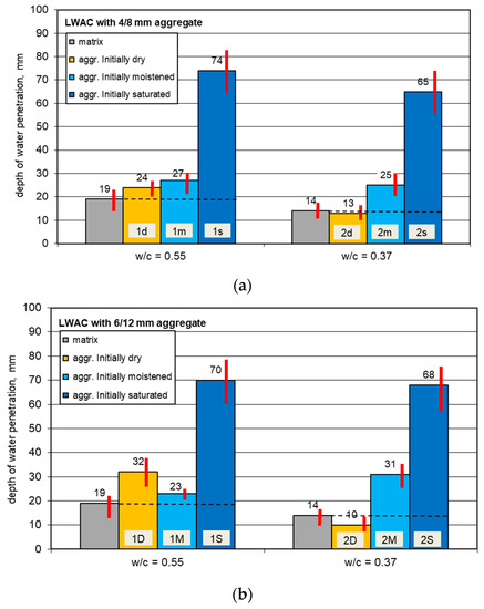 The impact of the aggregate’s initial moisture condition, aggregate size, and cement matrix on the depth of penetration of water under pressure in LWAC: (a) LWAC with aggregate 4/8 mm and (b) LWAC with aggregate 6/12 mm.