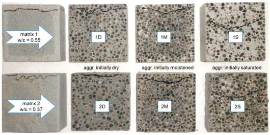The results for the depth of water penetration under pressure indicate that lightweight concretes made of both initially dry and moistened aggregates had a sufficient water tightness, even for structures or elements subject to aggressive exposures. In the case of concretes prepared with an initially saturated aggregate, the depth was several times higher than that of the other concretes. Interestingly, depending on whether the aggregate was initially pre-saturated or not, the type of cement matrix and the initial moisture content were less important. The biggest impact of the initial saturation of the aggregate may be explained by the poor adhesion of cement paste to the pre-saturated aggregate. Such a mechanism was proven by the fracture of specimens split after permeability tests (Figure 5 and Figure 6). In the case of concretes prepared with a pre-saturated aggregate, the common path of cracking occurred through the bond between the aggregate and cement paste. Meanwhile, for concretes made from an initially dry aggregate, this mode of fracture did not occur, and for concretes prepared with an initially moistened but not fully saturated aggregate, it was very rare. This may be explained not only by the lower share of mortar in concretes made with saturated aggregates (a higher matrix content would lead to the segregation of components), but above all, by the higher porosity and more numerous micro-cracks in the transition zone. Regardless of the w/c, the tested concretes with pre-saturated aggregate showed almost identical penetration depths. This suggests that the penetration of water under pressure occurs in the least tight areas which, in this case, was mainly the contact zone and not the matrix itself.