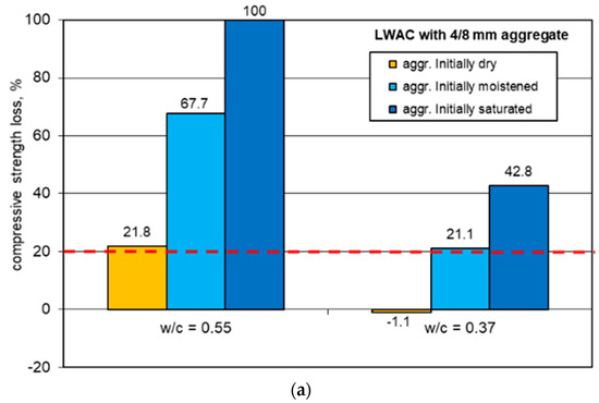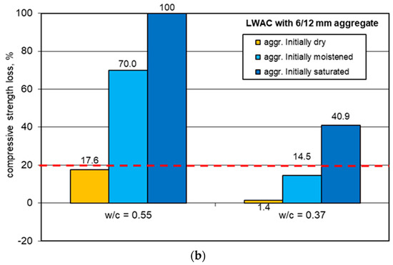The loss of compressive strength of LWAC after 150 freeze-thaw cycles: (a) LWAC with aggregate 4/8 mm and (b) LWAC with aggregate 6/12 mm.