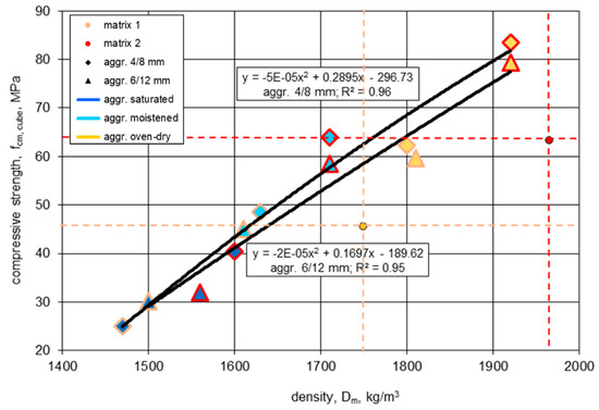 According to EN 206 [43], all tested concretes may be classified as structural and lightweight. Their strength classes ranged from LC16/18 up to LC60/66 and their density classes ranged from D1.6 to D2.0.