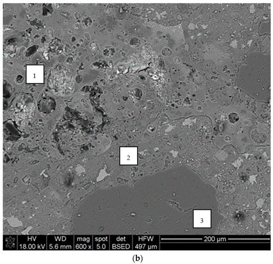 Interfacial transition zone in lightweight concretes with an aggregate (a) initially saturated—1S and (b) initially dried—1D (SEM: ×600); 1—LWA, 2—cement paste, and 3—sand particle.