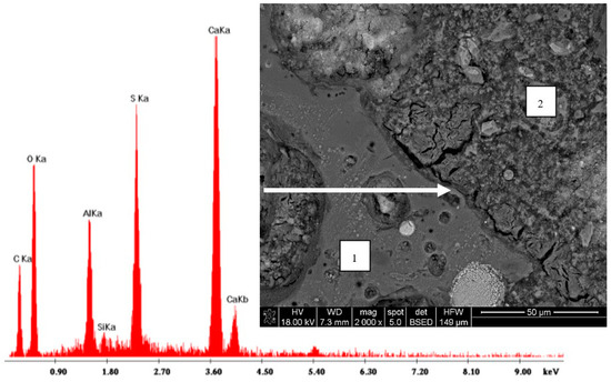 The analysis of the cement paste structure under larger magnification, as well as the EDS analysis of concretes with pre-saturated aggregates, showed that the visible microcracks were mainly connected to ettringite formation (Figure 12). In particular, many areas of an increased ettringite content and assisting microcracks were observed in the interfacial transition zone (ITZ). This observation is in contradiction to the models of the interfacial transition zone presented in [10], where no ITZ was assumed for saturated sintered fly ash aggregate concrete. Meanwhile, in this research, the concretes prepared with aggregates with a lower initial moisture content usually did not reveal a specific ITZ characterized by a higher porosity and a higher number of ettringite formations at all. As a result, concretes with pre-saturated aggregates, when they were subject to strength tests or freeze-thaw cycles, showed a visibly lower durability and a fracture path thorough the bonds between aggregates and cement paste.