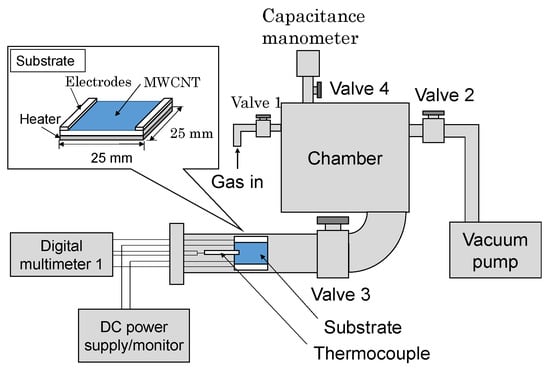 Figure 3 presents a schematic of our measurement system. The measurement section (main chamber) consists of stainless chamber (ICF070 defined by ISO), which is directly connected to a buffer chamber that is larger than 200 times in volume. The substrate coated with Pd/CNT nanoparticles was placed in the alumina casing fitted with a heater and a thermocouple; a digital multimeter and DC power supply were connected via feedthrough in order to measure the sheet resistance of CNT film. A typical procedure is as follows: First, the main and the buffer chambers were evacuated by a rotary vacuum pump to approximately 10 Pa; subsequently, valves 1 and 2 were closed and valve 3 was opened to introduce Ar/H2 (5 vol.% of H2) gas up to the target pressure (1 × 105 Pa for Figure 4 and Figure 5, 0.25 × 105 Pa for Figure 6 and Figure 7). Finally, we closed valve 3 and opened valve 2 for the measurement. If we anneal the substrate, this procedure should be conducted under vacuum at 60 °C. After the experiment, we opened valve 4 and introduced oxygen to remove hydrogen from the sample.