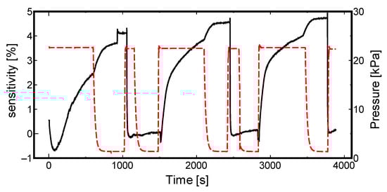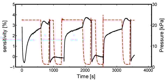 Second, we focused on the effect of temperature on the sensitivity of the sensor. As reported in our previous research [], the adsorption equilibrium constant is affected by the temperature, which in turn mildly influences the response of the resulting sensor. Figure 6 and Figure 7 display the data measured in winter (temperature less than 10 °C) and summer (temperature more than 25 °C), respectively, using sample 213-1, which showed higher sensitivity in Figure 4 and Figure 5; the solid line illustrates how the sensor sensitivity changes, and the dashed line illustrates the main chamber pressure change.