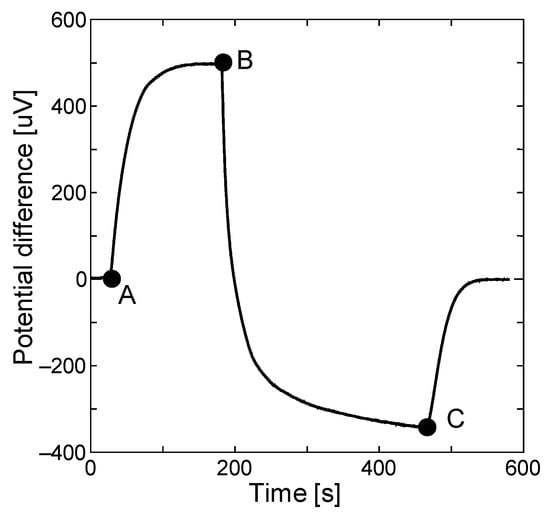 To investigate this strange fact, we measured the Seebeck effect. We applied a temperature gradient in the Pd/CNT film. We placed the film in the chamber, cooled and subsequently, heated the left side. The potential difference was measured using the expression: VL–VR. First, we evacuated the chamber and commenced the cooling and heating (A in Figure 8). After 200 s, the potential difference appeared to be saturated (B). At this stage, since the potential difference is positive, the main conductive carrier is a hole which is p-type behavior. Second, we introduced hydrogen into the chamber (B); the potential difference suddenly decreased and finally became negative (C). This behavior indicated that our film changed from p-type to n-type. Thereafter, we stopped the cooling and heating processes, so that the potential difference became zero.