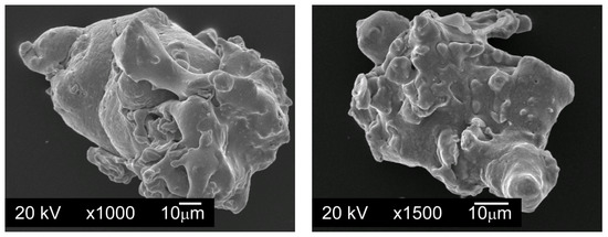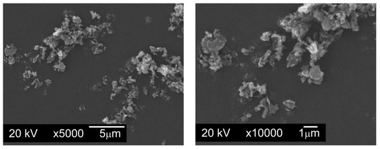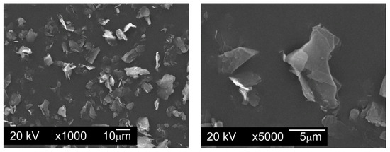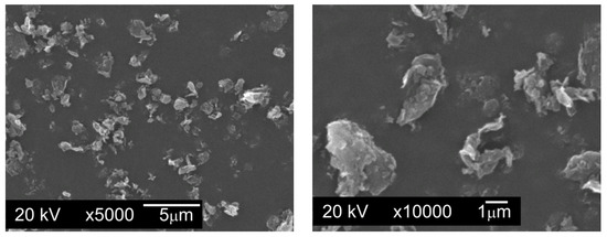Figure 3. Particles of graphite nanopowder with a BET (measurement technique of the specific surface area of materials based on Brunauer–Emmett–Teller theory [31]) specific surface area of 350 m2/g and range of particle size from 0.20 µm to 20 µm, SEM. - Graphite GS-2299—graphite nanopowder from Graphitestore.com (Northbrook, IL, USA) with a nominal BET specific surface area of 400 m2/g and range of particle size from 0.25 µm to 5.01 µm (Figure 4),