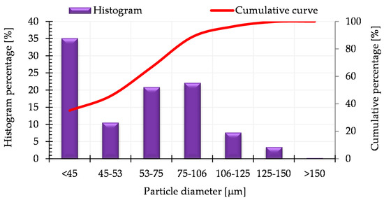 Figure 2 presents the histogram of the particle size distribution and the cumulative particle size distribution curve for the AISI 316L austenitic stainless steel powder (the data was provided by the manufacturer in the certificate for the powder analysis).