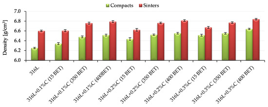 Figure 7 presents sample results of density measurements of compacts and sinters made of AISI 316L austenitic stainless steel powder and mixtures of this powder with graphite in the form of micropowder, nanopowders with a BET specific surface area of 350 m2/g and 400 m2/g. All tested samples were pressed on one side with a pressure of 600 MPa. The results shown in Figure 7 were obtained for samples sintered at the temperature 1280 °C. Standard deviations are marked on the bars presented in Figure 7.