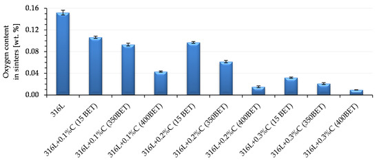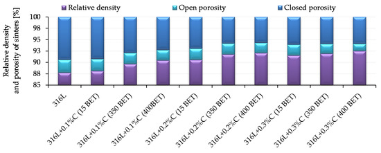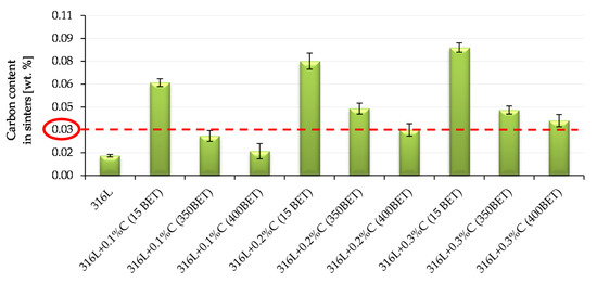 The introduction of additives in the form of the micro- and nanographite powders resulted in an increase in carbon content in samples after sintering—the greater the higher proportion of graphite in the mixtures. However, analyzing the obtained results, it can be observed that as the degree of BET specific surface area development of graphite particles increased, the measured carbon content in sinters significantly decreased. The highest carbon content after sintering, among the samples doped with graphite, had sinter made of AISI 316L steel with the addition of 0.3% by weight graphite micropowder with a BET specific surface area of 15 m2/g—it amounted to 0.084%. The carbon content in samples after sintering, equal to or not exceeding 0.03%, was characterized by only four of the tested sinters made of the following: pure powder of tested stainless steel and mixtures of this steel with the addition of 0.1% by weight of nanographite powders with a BET specific surfaces area of 350 m2/g and 400 m2/g and with 0.2% by weight of nanographite with a BET specific surface area of 400 m2/g. However, in the case of a sample made of AISI 316L steel with the addition of 0.3% by weight of graphite nanopowder with a BET specific surface area of 400 m2/g, the amount of carbon in the sinter slightly exceeded the limit value and amounted to 0.36%. However, it should be emphasized, that for this sinter the largest decrease in carbon content was noted in relation to its initial amount in the mixture from which it was made.