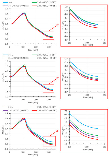 Dilatometric curves of the AISI 316L austenitic stainless steel powder and mixtures of this powder with the addition of 0.1%, 0.2%, and 0.3% by weight micrographite with a BET specific surface area of 15 m2/g and nanographites with a BET specific surface area of 350 m2/g and 400 m2/g (isothermal sintering temperature 1280 °C).