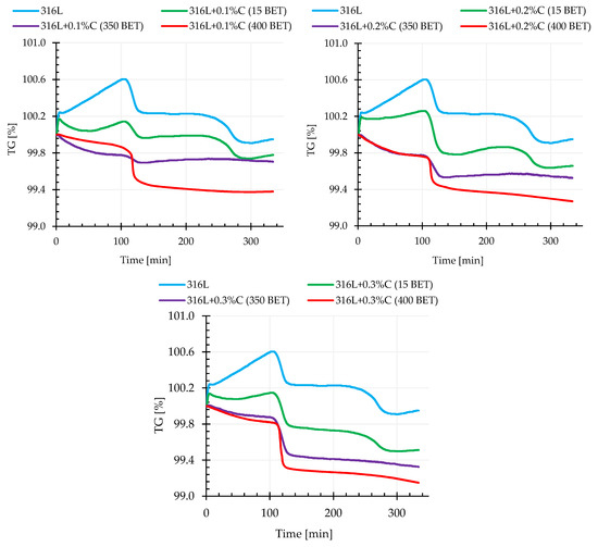 Thermogravimetric curves for the AISI 316L austenitic stainless steel powder and mixtures of this powder with the addition of 0.1%, 0.2%, and 0.3% by weight micrographite with a ET specific surface area of 15 m2/g and nanographites with a BET specific surface area of 350 m2/g and 400 m2/g (isothermal sintering temperature 1280 °C).