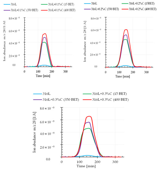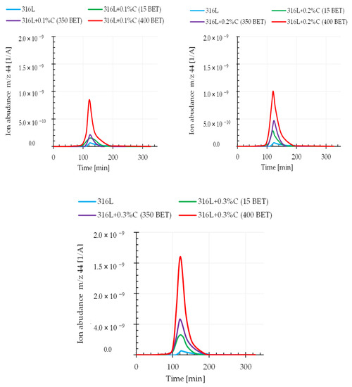 It can be assumed that the relationship between the weight loss and the amount and type of graphite powders added to the AISI 316L powder is closely related to the intensification of the carbon oxide reduction reaction occurring during the sintering process. This assumption is confirmed by the results obtained from quadrupole mass spectroscopy (QMS). This analysis allowed us to determine the composition of gaseous products released during sintering of the tested samples. This work focuses on the analysis of mass spectra corresponding to the carbon dioxide CO2 (atomic mass 44), the carbon monoxide CO (atomic mass 28), and the carbon C (atomic mass 12) during sintering of the tested graphite doped steel.