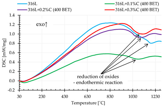 Differential scanning calorimetry (DSC) allowed determination of the influence of the composition of tested mixtures of powders and sintering temperature on the rate of heat supplied to the tested sample in relation to the control sample. Based on the obtained calorimetric curves, it was found that in the temperature range from about 900 °C to 1200 °C, the addition of graphite powder caused an increase in the rate of heat supply to the test sample in relation to the control sample. This is demonstrated by the endothermic peaks visible on the recorded curves. The sizes of these peaks, understood here as the areas under the peaks, were the higher, the higher the isothermal sintering temperature, amount of carbon addition and BET specific surface area of the graphite particles. This is due to the fact that the reaction of metal oxide reduction is endoenergetic, and as demonstrated in the conducted tests, in the case of sintering of AISI 316L powder with the addition of graphite, the reactions of oxide reduction occurred more intensively compared to unmodified steel powder. It is also worth emphasizing that in the case of measurements carried out for loosely filled, unmodified powder of the tested stainless steel, a significant shift of the recorded thermal effect towards higher temperatures and a significant reduction of its intensity in relation to samples with the addition of graphite powders were observed. Figure 13 shows examples of calorimetric curves for the heating stage to a temperature of 1280 °C determined for pure austenitic stainless steel powder and its mixtures with the addition of 0.1%, 0.2%, and 0.3% by weight of graphite nanopowder with a BET specific surface area of its particles equal to 400 m2/g.
