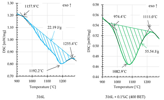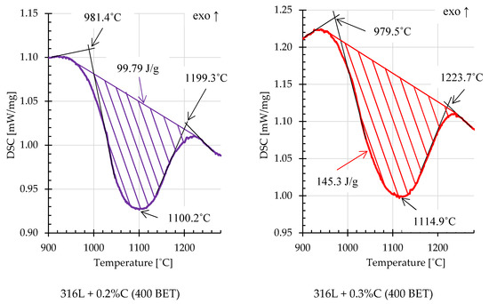 Fragments of DSC curves, illustrating examples of endothermic thermal effects for AISI 316L steel powder and its mixture with the addition of 0.1% wt. graphite nanopowder with a BET specific surface area of 400 m2/g (isothermal sintering temperature 1280 °C).